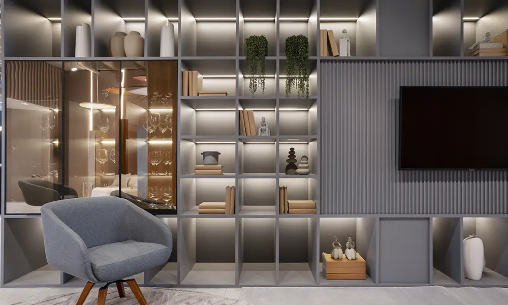Essa variação influencia diretamente como percebemos o ambiente. Uma estante clara pode parecer sem volume com iluminação frontal intensa, enquanto uma luz posicionada de forma mais baixa destaca nichos, recortes e objetos decorativos de maneira muito mais natural. Da mesma forma, painéis lisos ficam mais elegantes quando iluminados de forma indireta, evitando reflexos excessivos que distorcem a cor.