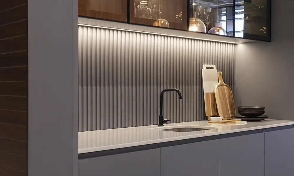 A Italínea oferece soluções de mobiliário que dialogam com a iluminação de forma natural. Cristaleiras com LED interno, nichos iluminados, painéis ripados com luz embutida e roupeiros iluminados reforçam o design dos móveis e tornam o ambiente mais elegante e funcional. Nas cozinhas, a combinação de luz para tarefas e luz ambiente cria equilíbrio entre o uso diário e a estética.
