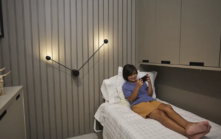 Spots direcionáveis definem pontos de luz no quarto e destacam volumes do mobiliário, criando profundidade sem pesar no ambiente. Foto: Haluz